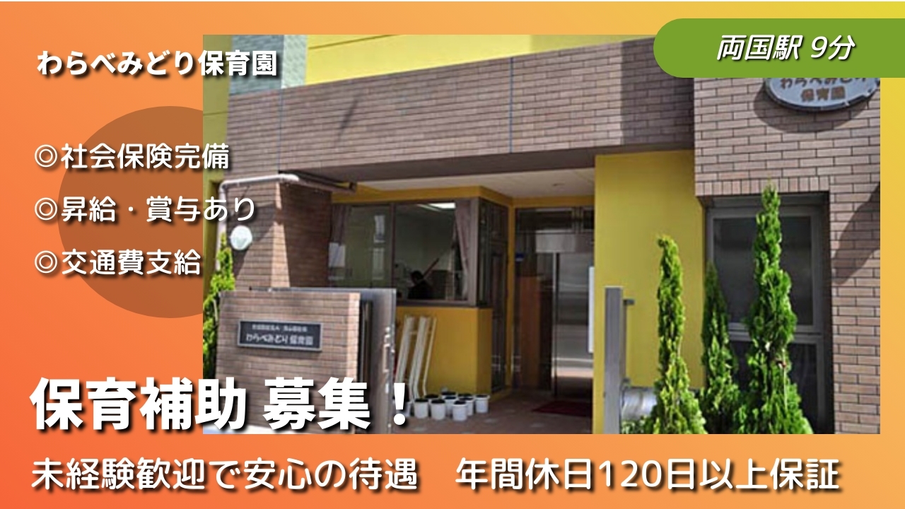 保育補助わらべみどり保育園社会保険完備昇給・賞与あり交通費支給年間休日120日以上退職金あり東京都墨田区緑アルバイト・パート¥時給 1,226円〜保育士は、クラス担任または保育業務全般を担当し、子どもたちの日常生活や成長を支えます。求人をみる